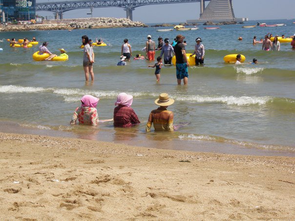 Fully clothed Koreans on the beach in Busan.Korean BBQ and Kimchi - I can't remember what it's called in Korean.