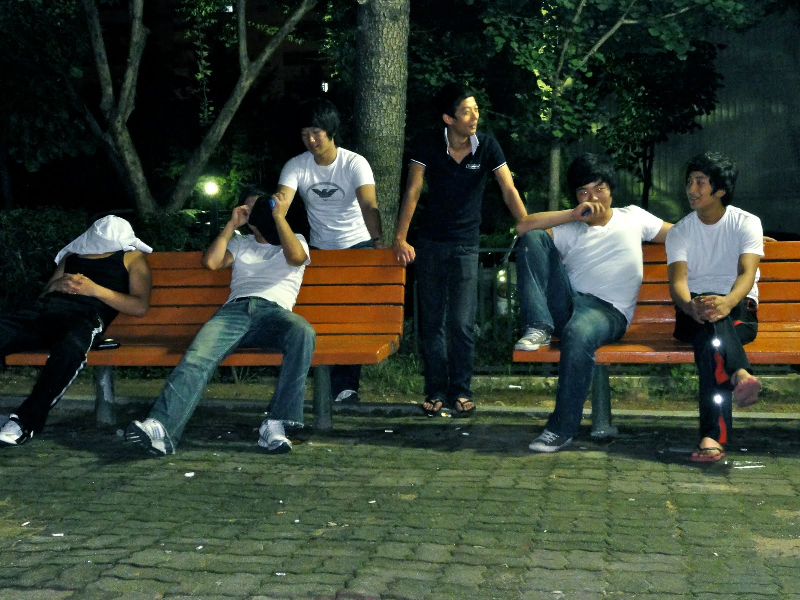 Two friends from our school played an open-mic night at a bar called Commune. The other acts were pretty dreadful, but my friends were quite good, honestly. Wednesday appeared to be a pretty slow night for the downtown scene, and at about 2am we headed back to a Sang-In area park where the boys continued to play guitars, ukulele and harmonica and sing classic covers. Shortly after, a group of high school Korean boys showed up and grabbed themselves some seats within viewing and listening distance. They made sure to give a loud enough applause for us to hear after songs that they were fans of. I couldn't help but go up to them and snap a photo. They loved it.